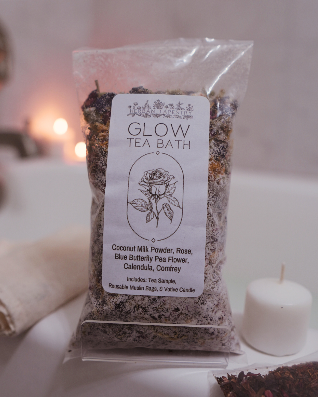 Create a luxurious & skin-nourishing bath with Glow. This botanical blend combines the moisturizing properties of Coconut Milk with the herbal powers of Calendua, Comfrey, and Rose, known for their ability to soothe skin troubled by redness, dryness, and acne.