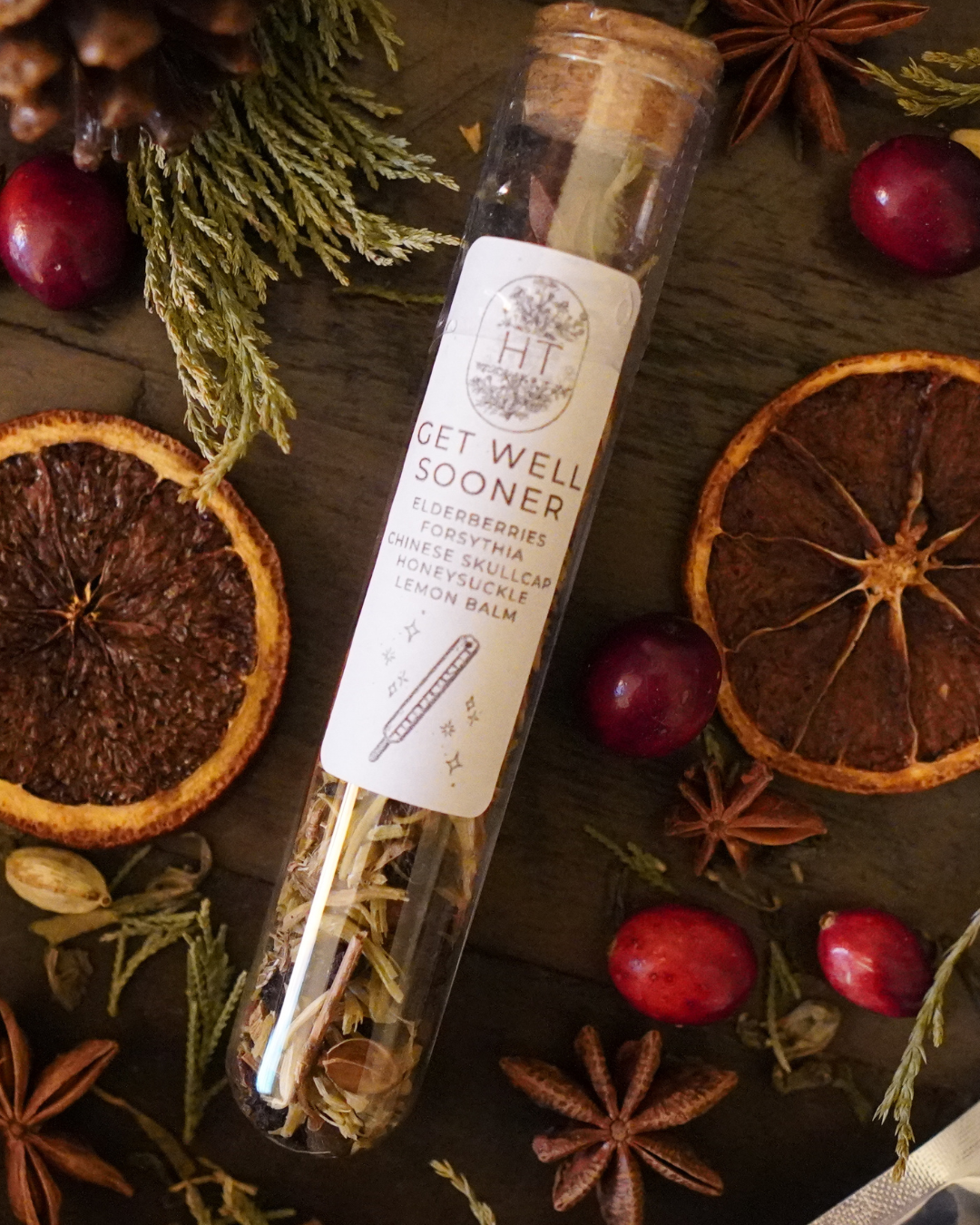 Several servings of loose leaf herbal blends, thoughtfully packaged in a clear glass vial—perfect for sampling and gifting!