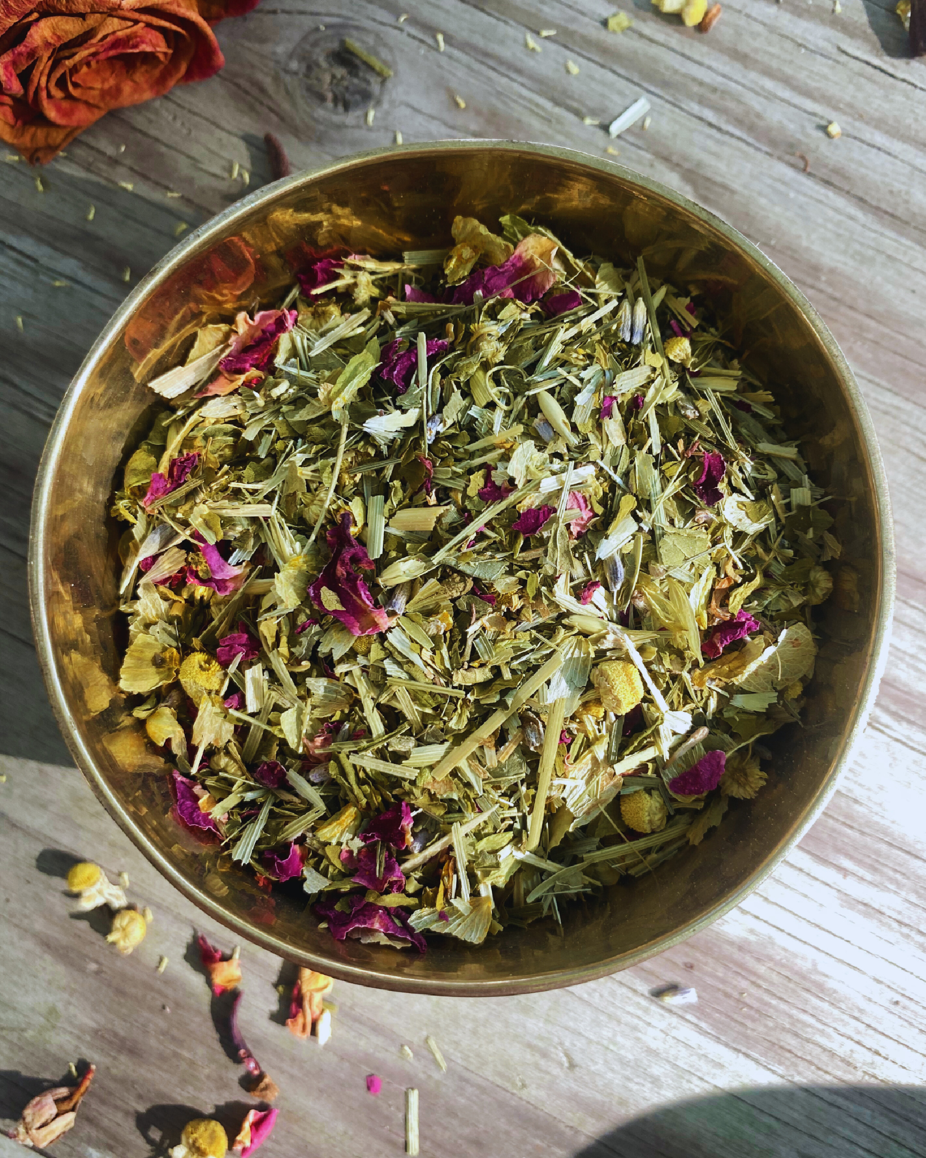 Oatstraw, Chamomile, Passionflower, Skullcap, Hops, Rose, Lavender