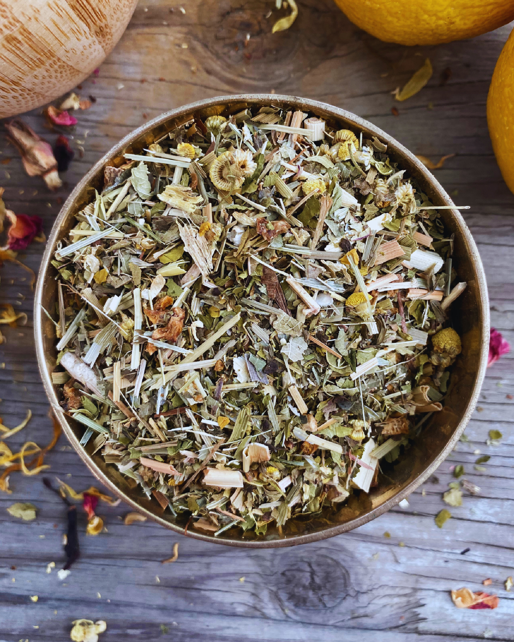 Lemon Peel, Lemongrass, Lemon Verbena, Oatstraw, Eleuthero, Licorice, Chamomile, Skullcap, Lemon Balm