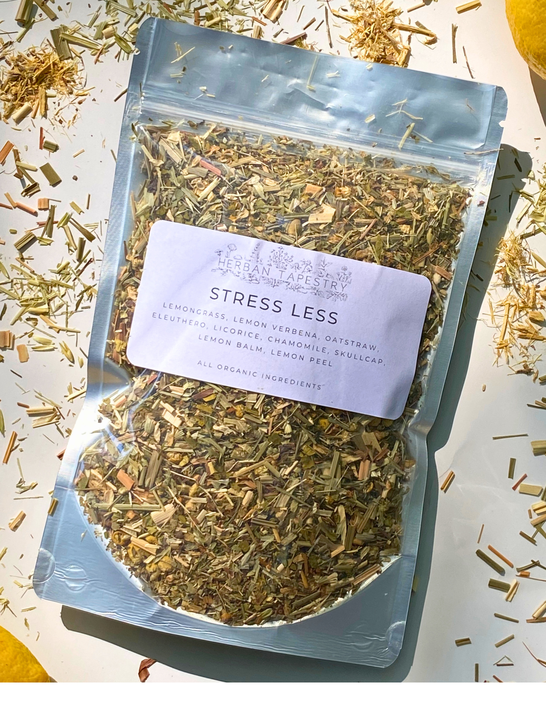 Find your calm with our Stress Less blend, filled with herbs that are known nervine relaxants to help bring you back to a soothing baseline. Best used in times of heightened stress and anxiety, or at the end of a long day.